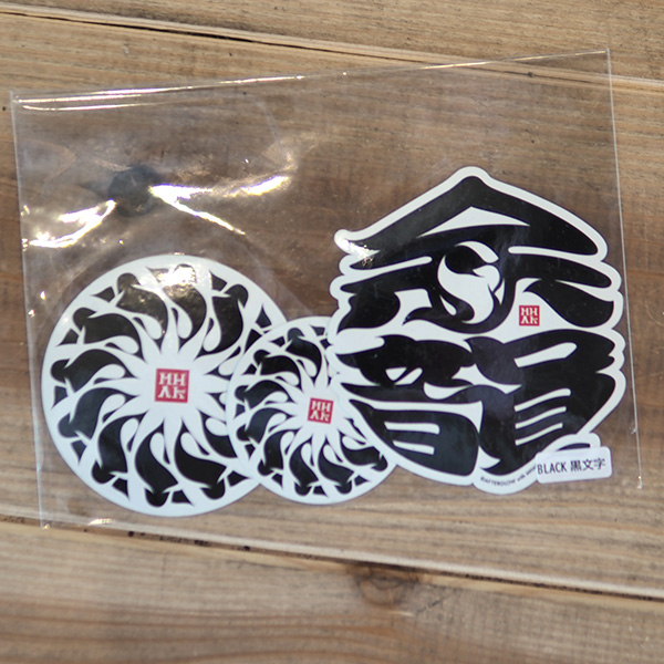 AFTERLOW=余韻の漢字をモチーフにした『和』なデザインの型抜きステッカーと、MHAK氏のグラフィックがサークル状に配されたデザインの、丸形×2サイズの計3枚セットです。