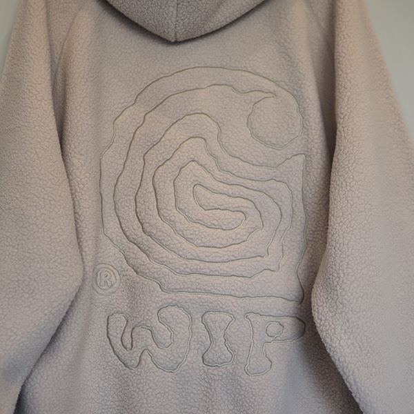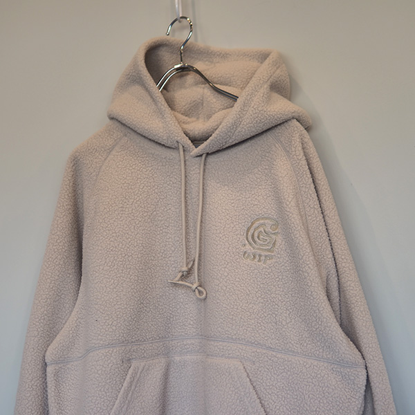 起毛フリースのような裏地が施されており、バルーンフィットで、少しゆったりとボクシーでドロップショルダーとリブトリムが特徴。グラフィックプリントは表と裏に刺繍入り。