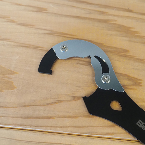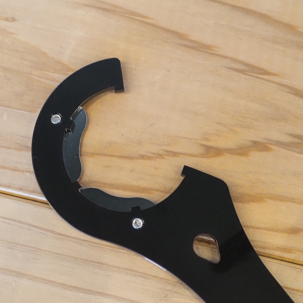BBLT5(ボトムブラケットロックリングツール)は、NJS認定のBBロックリングを調整するのに最適なBB Toolです。クランクを外さず作業ができるオープン型レンチに、BBと工具を平行に保つガイドプレートを付けました。掛け損じを防止し、僅か約3.5ミリのアルミ製ロックリングにも安定したトルクを掛けられます。5つの突起をBBの溝にはめてトルクをダイレクトに伝えられるストレート形状で、正確な作業を実現。NJSのBB(シマノ、スギノ、ハッタ)とカンパニョーロのロックリングにもフィットする設計となっております。グリップを安定させるため、厚み約8mmのトリプルプレートハンドルを独自に開発。プレートの角を削り落としているので、力強く握っても手のひらが痛くなりません。引っ掛け穴を、ハンドル側と工具側の二か所に設けています。