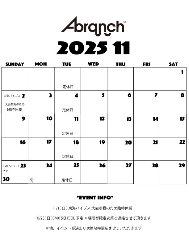 今年も残すところ2ヶ月。夜になると息が白くなってきたり、立山では雪が降ったりとで冬の季節となってきました。今月からどんどんSnowグッズも入荷し、アパレルもボリュームもアップしております。BMXスクールは11/23(日)を予定しております。場所がまだ確定しておりませんので決まり次第ご連絡させて頂きます。11月もA-branchと一緒に楽しみましょう。宜しくお願いします。