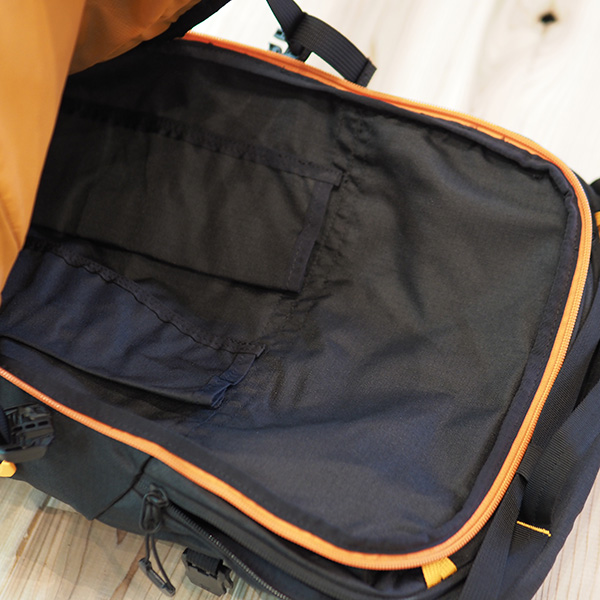 アバランチ収納も単独であり、上部には小物ポケットとゴーグルなども入れるポケット、メインポケットにアクセスも可能。