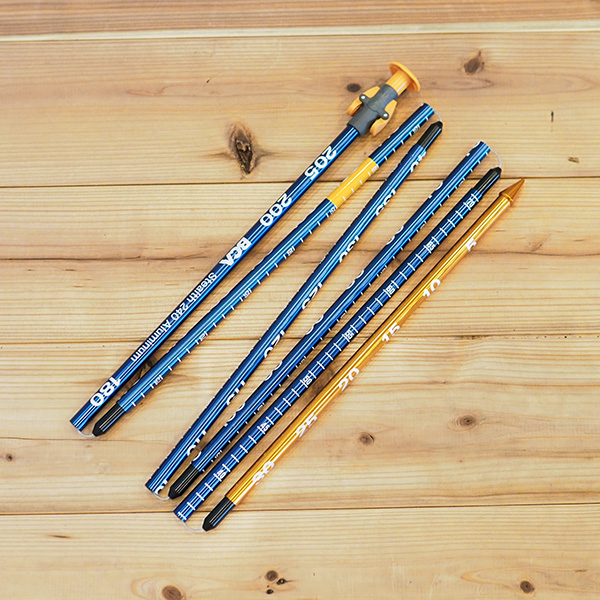 プローブには雪の深度をオレンジ色で強調表示されています:1.5m(粗いプロービング用)、2.5m(正確なプロービング用)、さらにより深くに積雪の底が近づいていることを警告します。