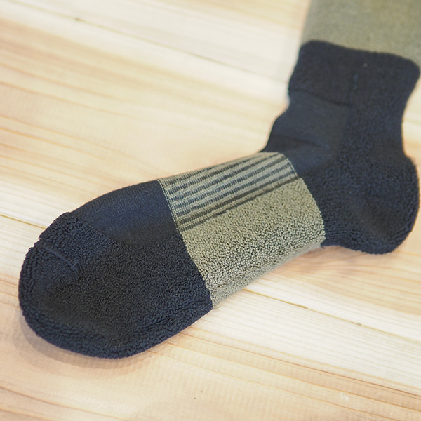 超撥水ポリエステルとナイロンをブレンドすることでウール素材の弱点である強度面にも配慮。ソックスのほぼ全体をパイル編みしたこのモデル『ALP(アルプ)』は高い保温性と吸湿性、消臭性、クッション性に優れたハイブリッドソックス に仕上がっています。