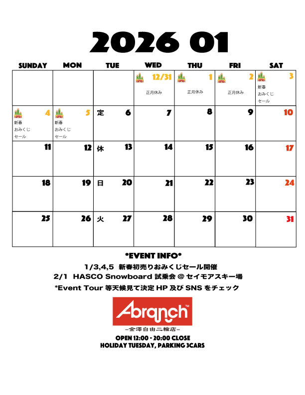 1/3,4,5は毎年恒例の新春初売りおみくじセールを開催。10%-50%のセールプライスのおみくじを当てて下さいませ。完成車、フレーム、パーツ、洋服、スノーボードなど対象はほぼ全ての商品が対象となりますのでこの機会にぜひご自身のグッズをバージョンアップしてくださいませ。